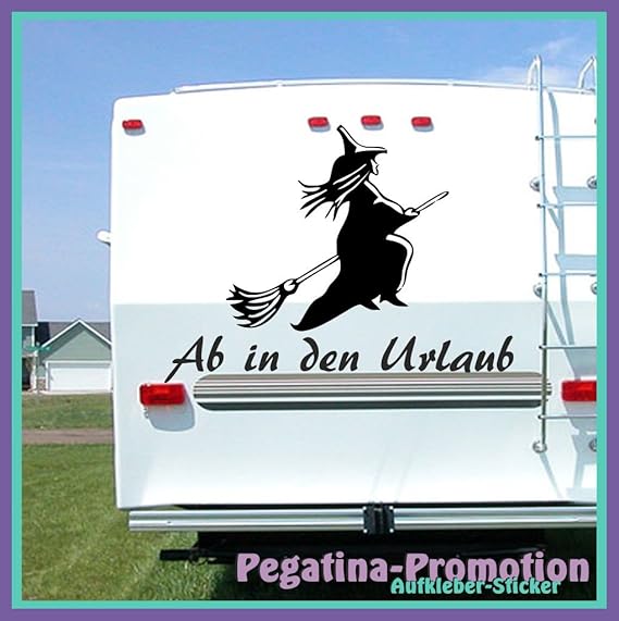 Hochwertige Wohnwagen Wohnmobil Aufkleber Fliegende Hexe Mit Spruch Ab In Den Urlaub 80x60 Cm Von Pegatina Promotion Aus Hochleistungsfolie Geplottet Auf Montagefolie Ohne Hintergrund Lustige Spruche Deko Dekoration Ihres